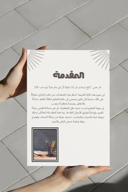 ملف إلكتروني بتصميم احترافي مُصمم خصيصًا ليعكس تميّز المعلمة ويُبرز رحلتها التربوية بشكل منظم وواضح. يتيح لك ملف الإنجاز تنظيم جميع تفاصيل مسيرتك التعليمية بطريقة مهنية وسهلة، ويشمل أقسامًا مرنة تساعدك على توثيق كل إنجازاتك الأكاديمية. سواء كنتِ تستخدمينه في المقابلات أو لتقديم تقرير شامل، فإن هذا الملف سيكون رفيقك المناسب لتسليط الضوء على جهدك.